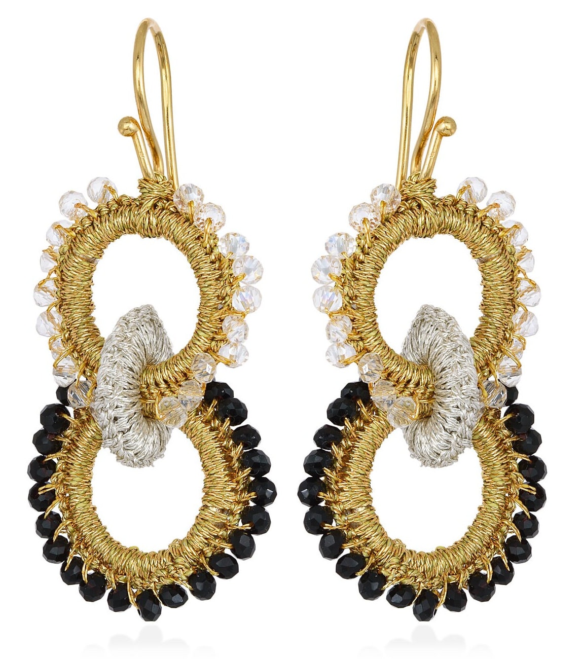 High quality materials have been used for these handcrafted earrings, faceted black and transparent beads (1mm), gold plated silver base hook (925), gold and silver thread.