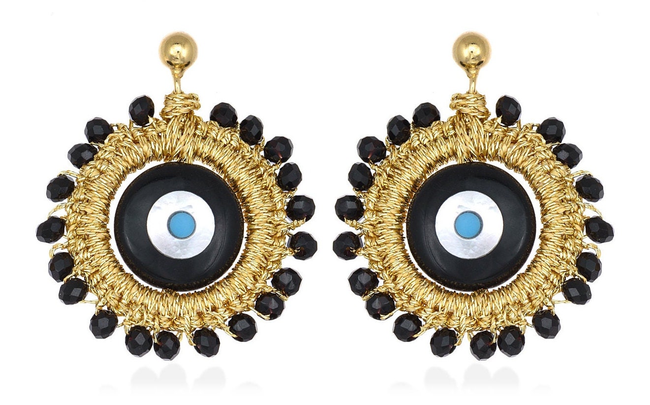 High quality materials have been used for these handcrafted earrings such as, evil eye, black crystal beads (1mm), gold plated earstuds with silver base (925) butterfly closure and gold thread.
