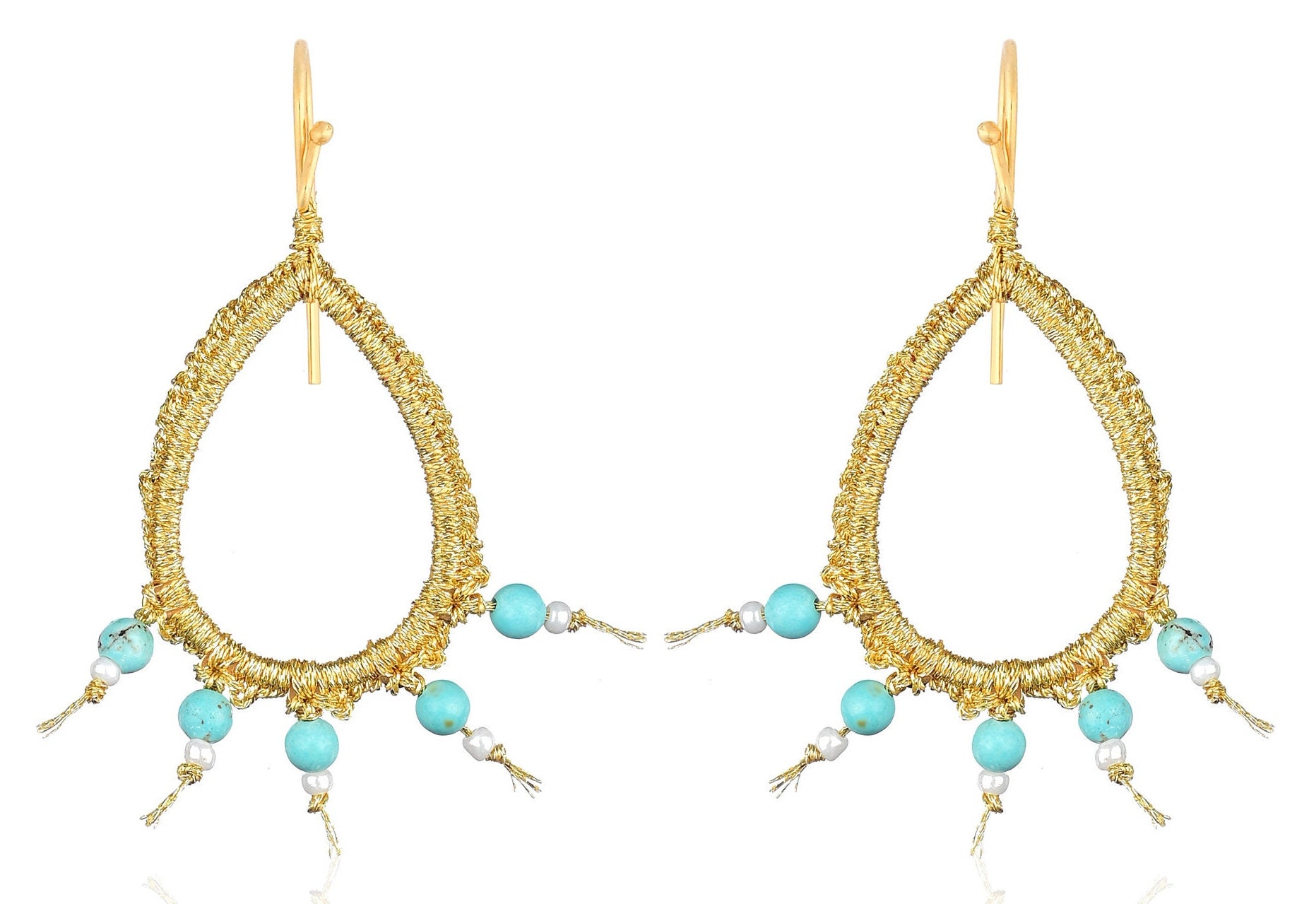 High quality materials have been used for these handcrafted earrings, such as gold plated silver base (925) hook, turquoise howlite, white beads and gold thread.
