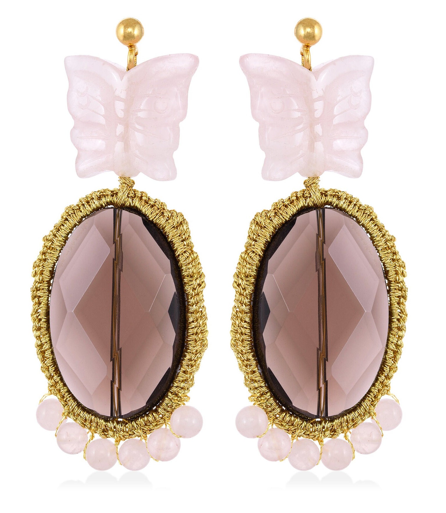 High quality materials have been used for these handcrafted earrings, smoky quartz, pink quartz, gold plated ear studs with silver base (925) and butterfly closure, gold thread. (Each semi-precious stone is unique and not identical)
