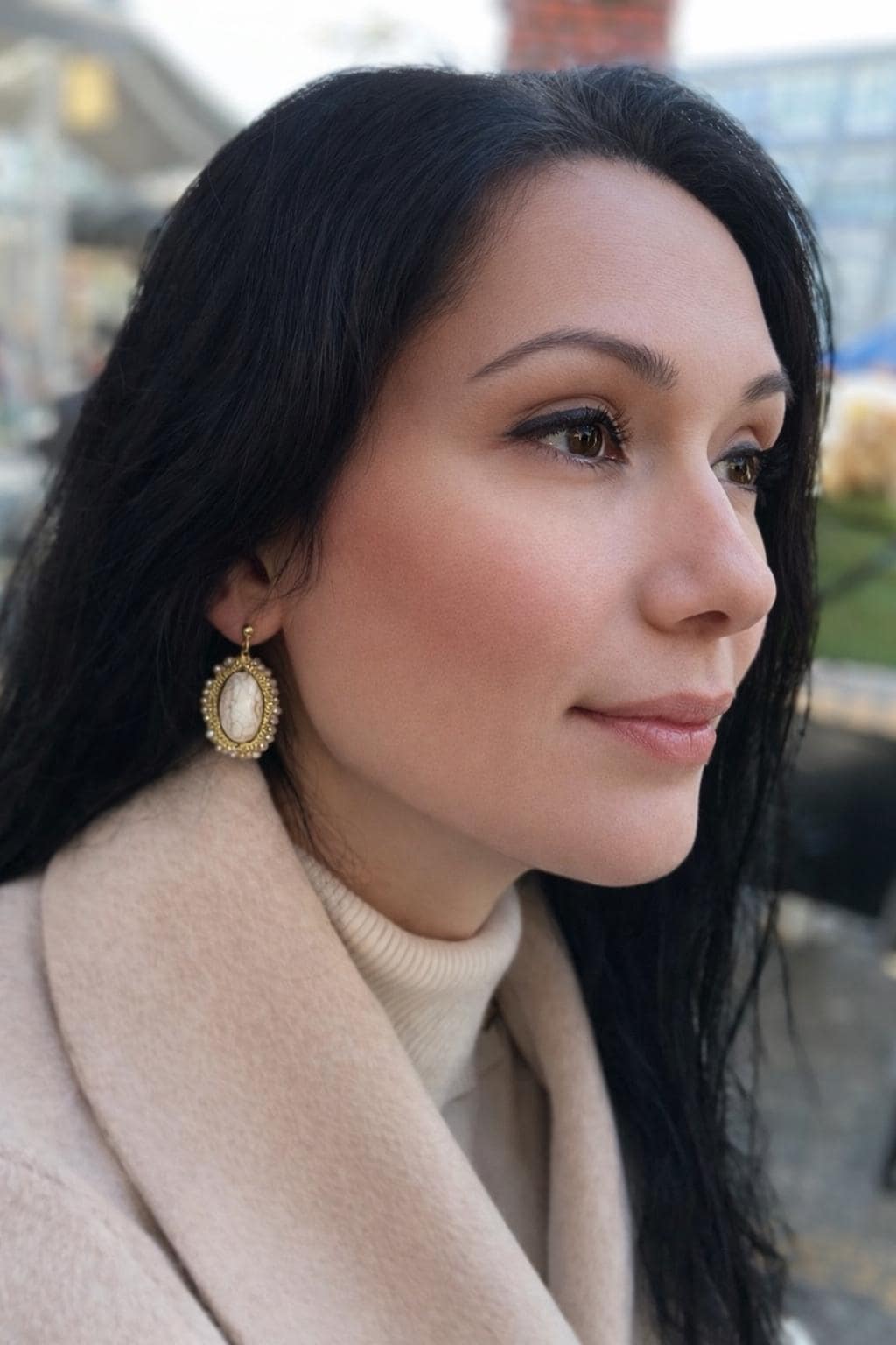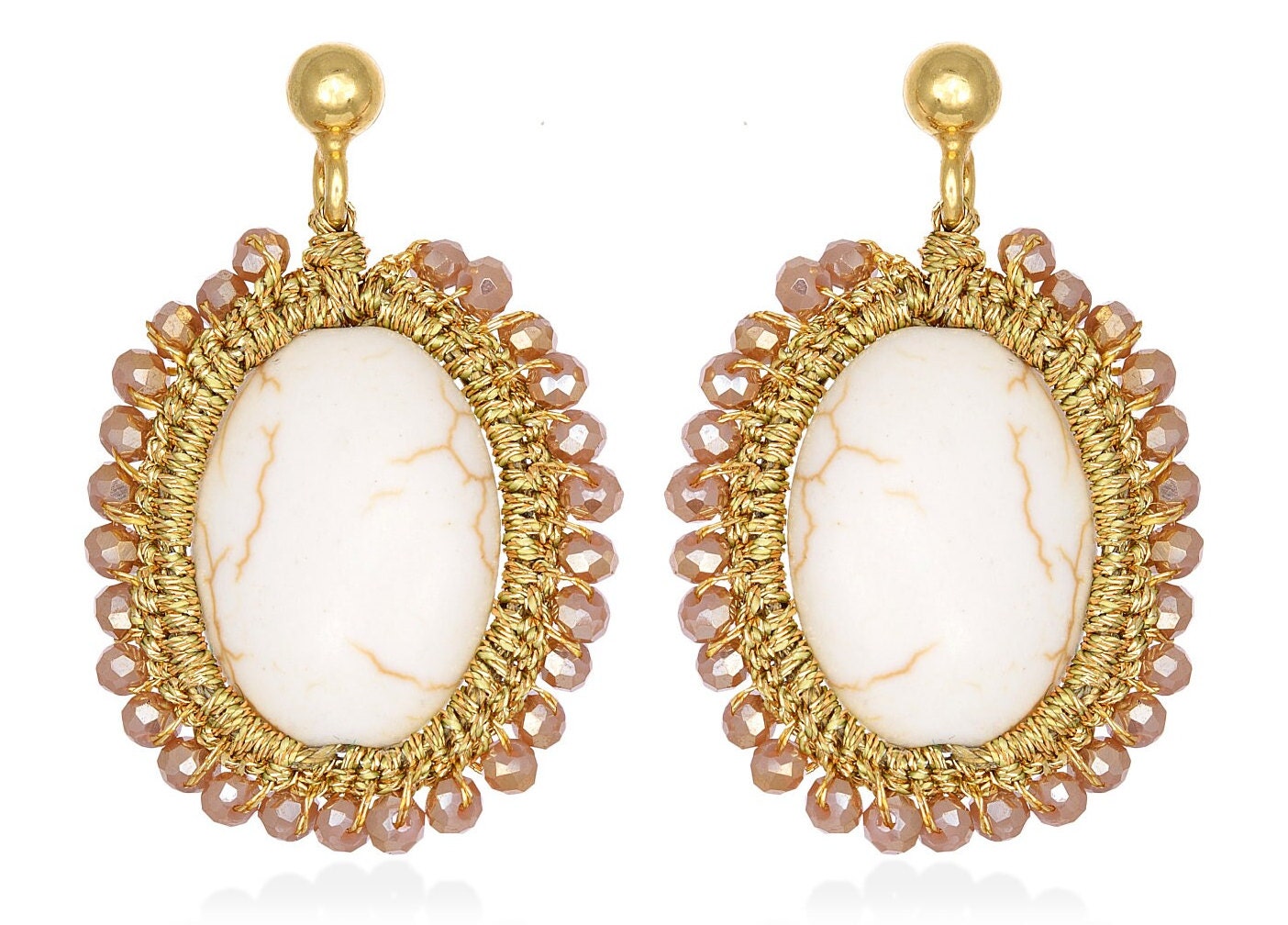 High quality materials have been used for these handcrafted earrings, such as howlite, faceted crystal caramel beads (1mm), plated ear studs with silver base (925) and butterfly closure, gold thread. Each semi-precious stone is unique and not identical