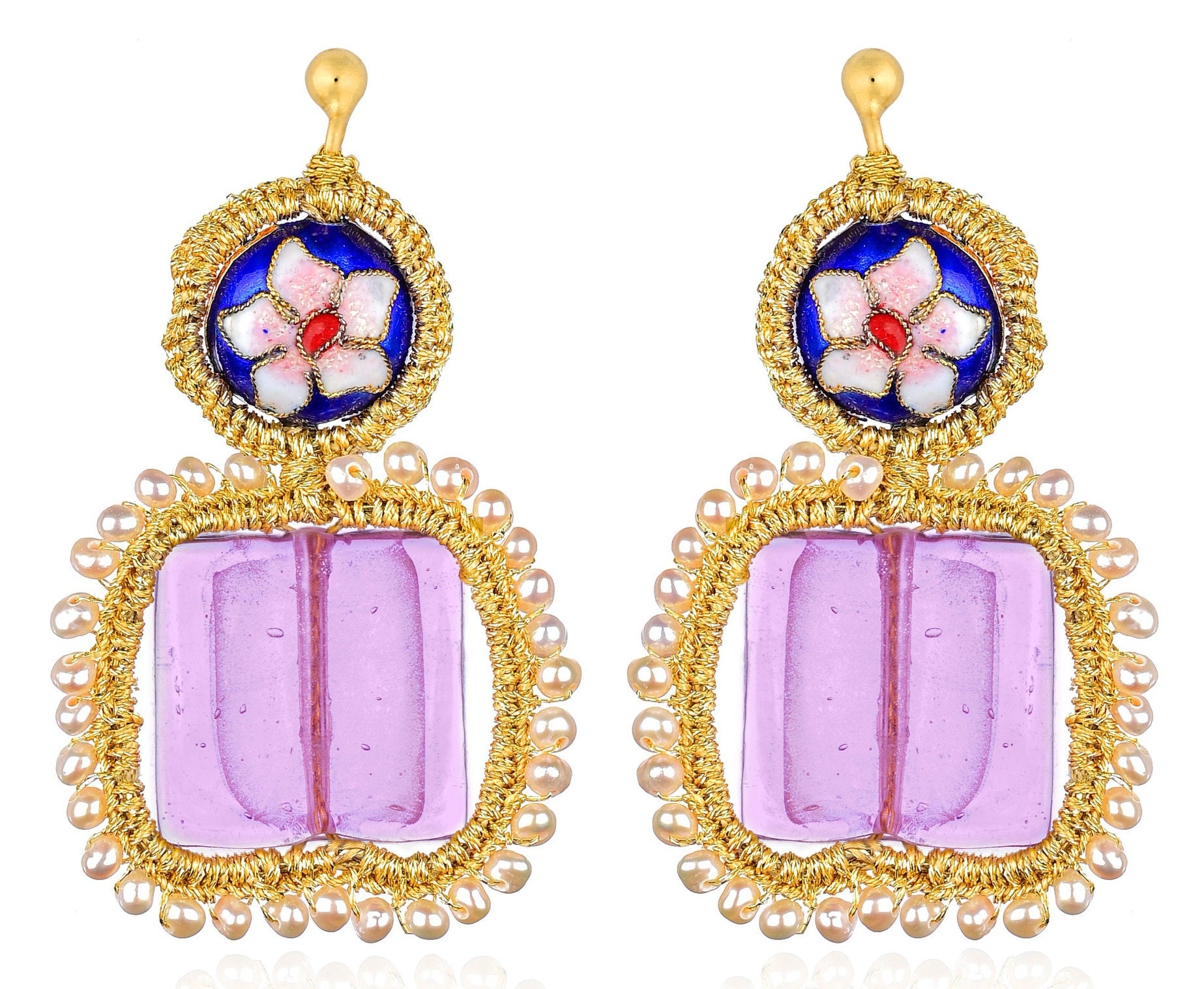 High quality materials have been used for these handcrafted earrings, purple murano, cloisons beads, freswater pearls 3.5mm, gold plated ear studs with silver base (925) and butterfly closure, gold thread. (Each semi-precious stone is unique and not identical)