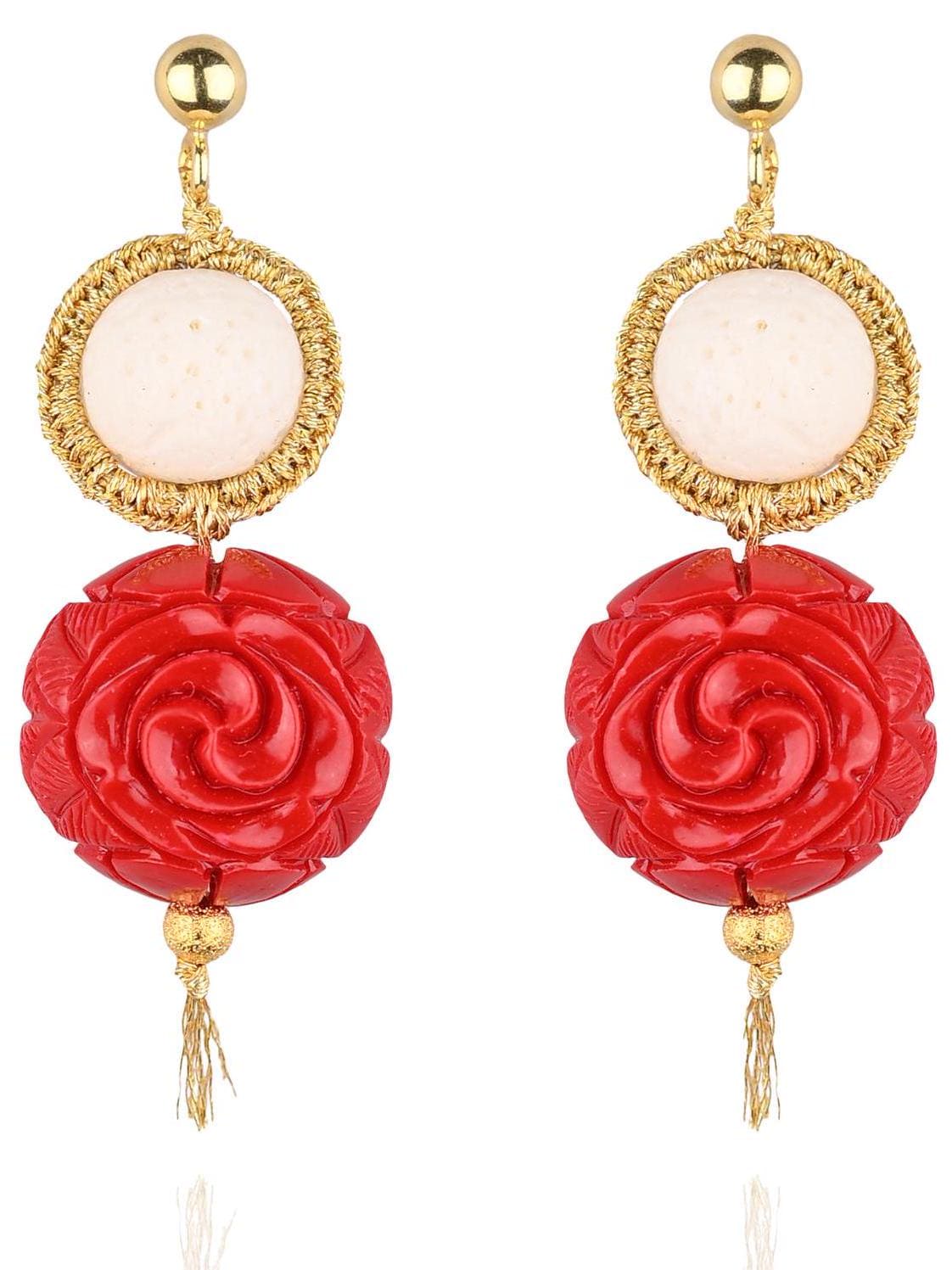 High quality materials have been used for these handcrafted earrings, coral carved acrylic, white coral, gold plated ear studs with silver base (925) butterfly closure and gold thread. (Each semi-precious stone is unique and not identical)