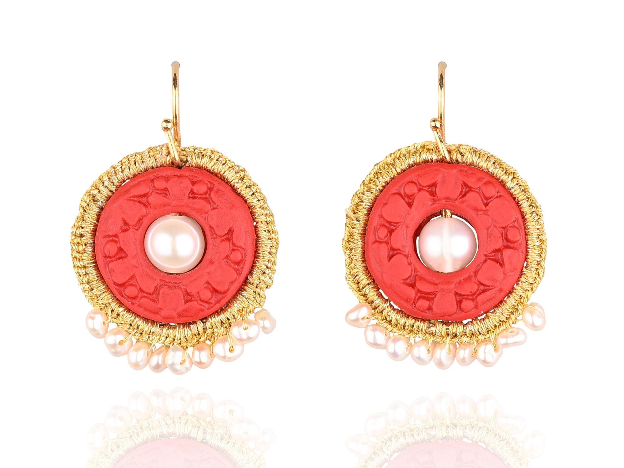 High quality materials have been used for these handcrafted earrings, coral carved cinnabar, freshwater pearls, gold plated silver base hook (925) and gold thread. (Each semi-precious stone is unique and not identical)