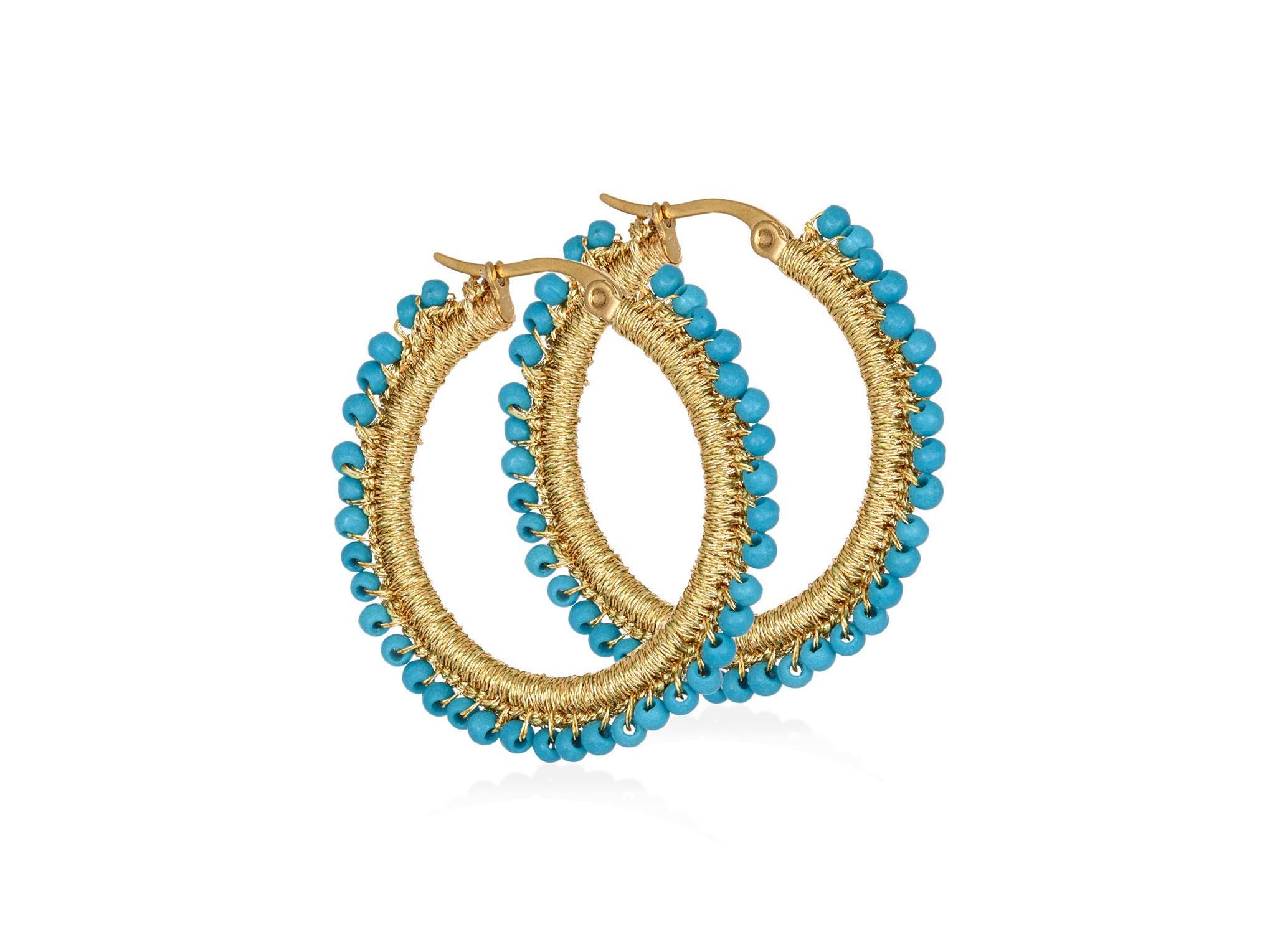 High quality materials have been used for these handcrafted earrings, such as steel hoops, howlite beads (1mm), gold thread.