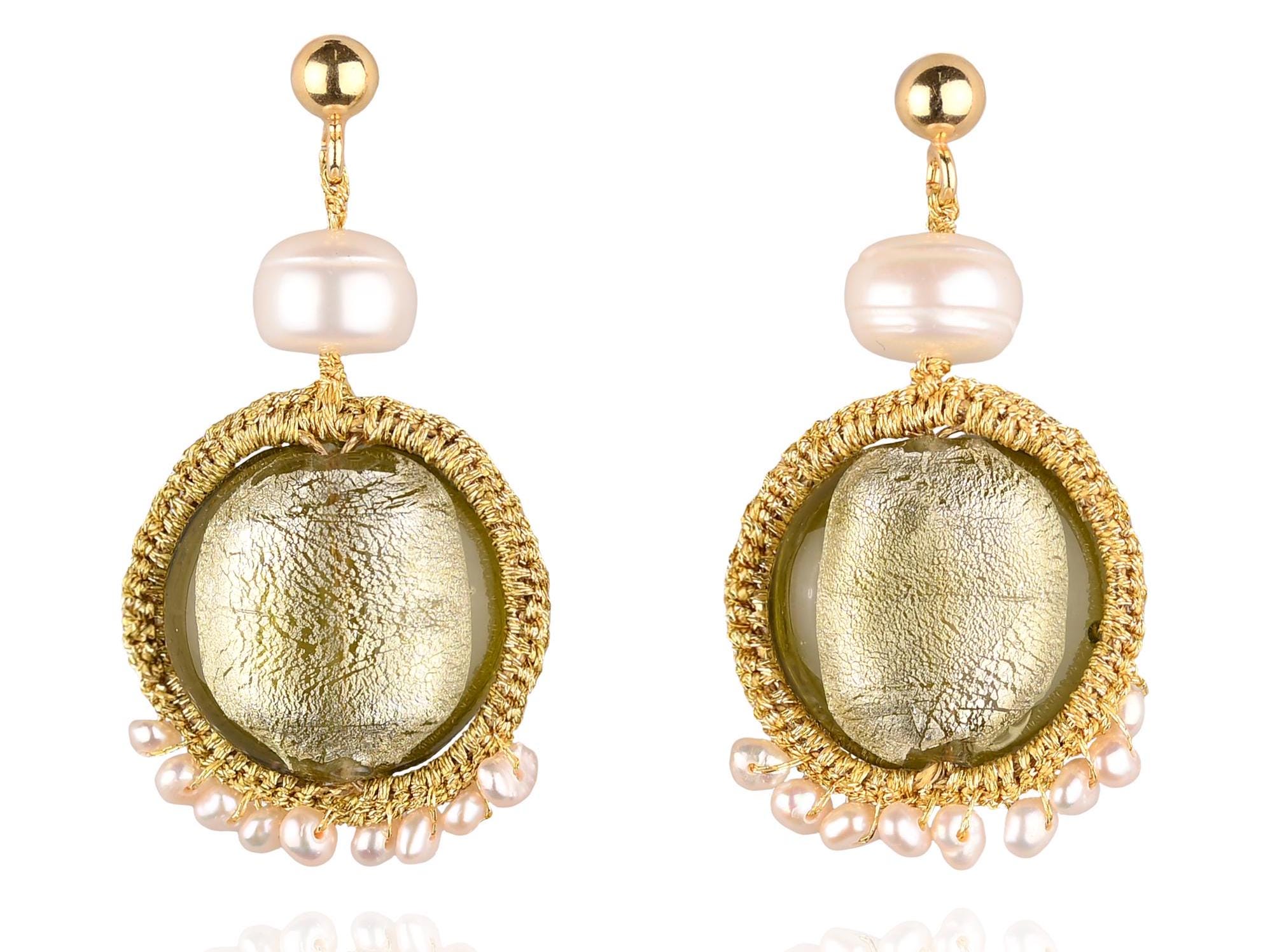 High quality materials have been used for these handcrafted earrings, such as murano glass, freshwater pearls, gold plated ear studs with silver base (925) butterfly closure and gold thread. Each semi-precious stone is unique and not identical