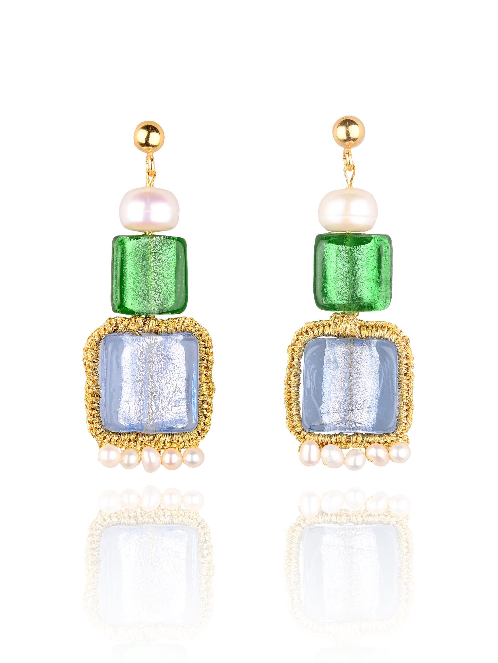 High quality materials have been used for these handcrafted earrings, Murano glass, freshwater pearls, gold plated ear studs with silver base (925) and gold thread. (Each semi-precious stone is unique and not identical)