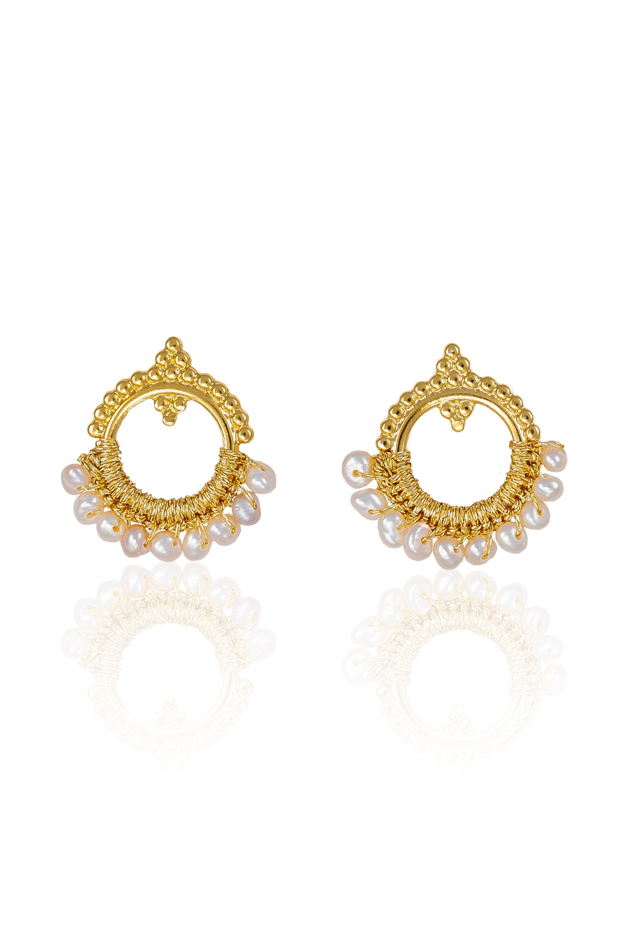 High quality materials have been used for these handcrafted earrings, such as stainless steel ear studs with butterfly closure, freshwater pearls, gold thread.