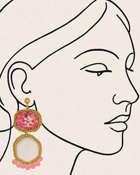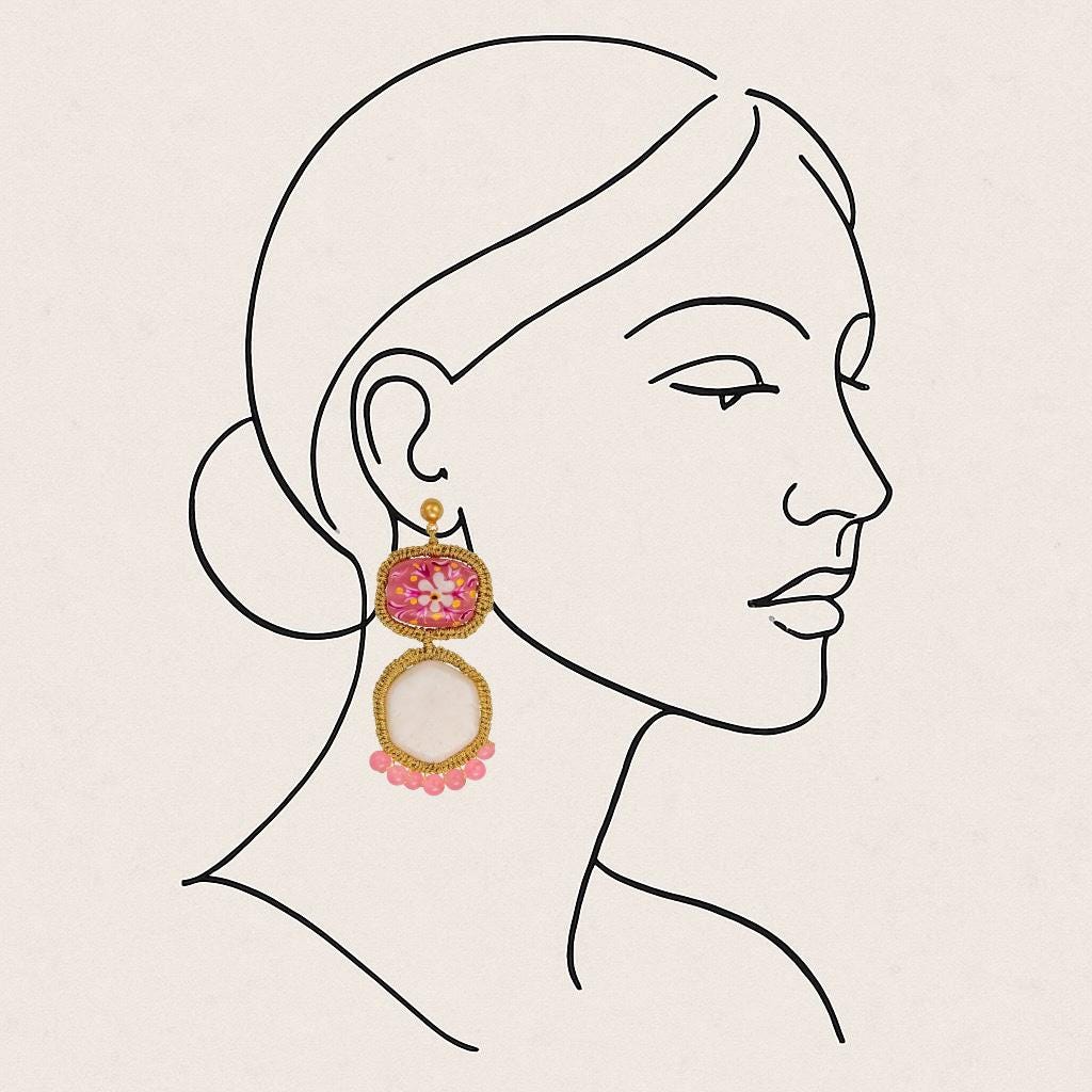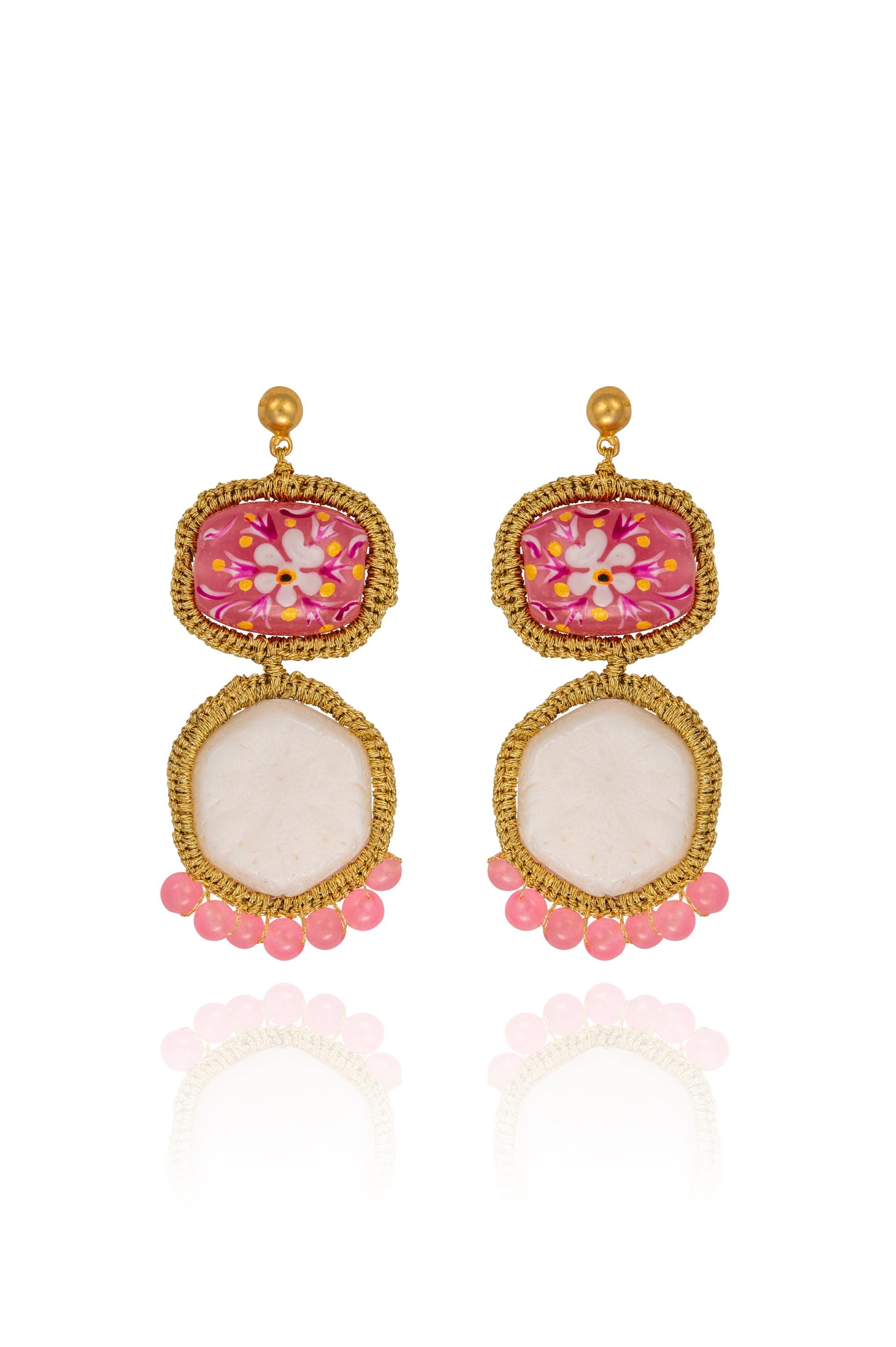 High quality materials have been used for these handcrafted earrings, white hexagon coral, painted glass, pink jade 2mm , gold plated ear studs with silver base (925) and butterfly closure, gold thread. (Each semi-precious stone is unique and not identical)