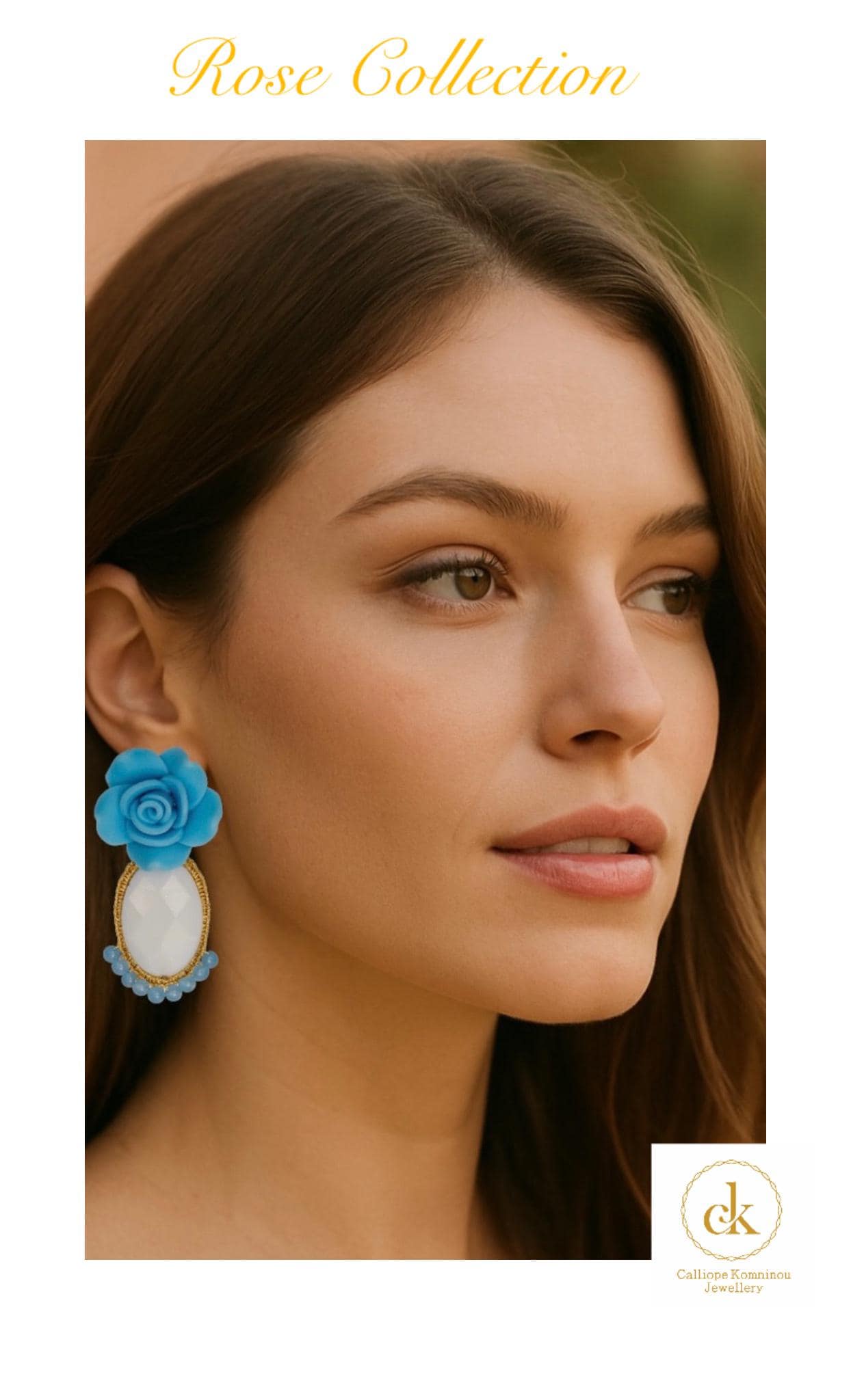 Rose earrings collection is inspired by the timeless beauty of nature, The designer sought to capture the delicate elegance of blooming roses and the purity of natural stones. The handcrafted polymer clay rose symbolizes romance and grace, while the white faceted onyx and light blue howlite beads reflect clarity and inner peace. Each piece is a tribute to femininity and natural beauty, crafted with meticulous attention to detail to celebrate elegance in its purest form.